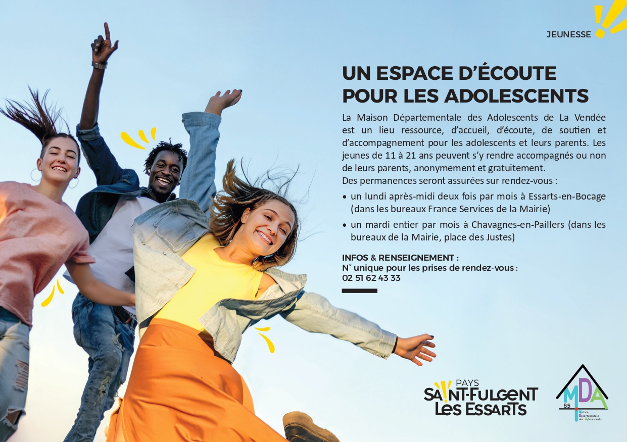 Pour 𝗮𝗰𝗰𝗼𝗺𝗽𝗮𝗴𝗻𝗲𝗿 𝗹𝗲𝘀 𝗷𝗲𝘂𝗻𝗲𝘀 dans leurs questionnements et leur bien-être, la 𝗠𝗮𝗶𝘀𝗼𝗻 𝗗𝗲́𝗽𝗮𝗿𝘁𝗲𝗺𝗲𝗻𝘁𝗮𝗹𝗲 𝗱𝗲𝘀 𝗔𝗱𝗼𝗹𝗲𝘀𝗰𝗲𝗻𝘁𝘀 𝗱𝗲 𝗹𝗮 𝗩𝗲𝗻𝗱𝗲́𝗲 (𝗠𝗗𝗔), en partenariat avec la Communauté de communes, propose des permanences locales pour les 𝟭𝟭-𝟮𝟭 𝗮𝗻𝘀.